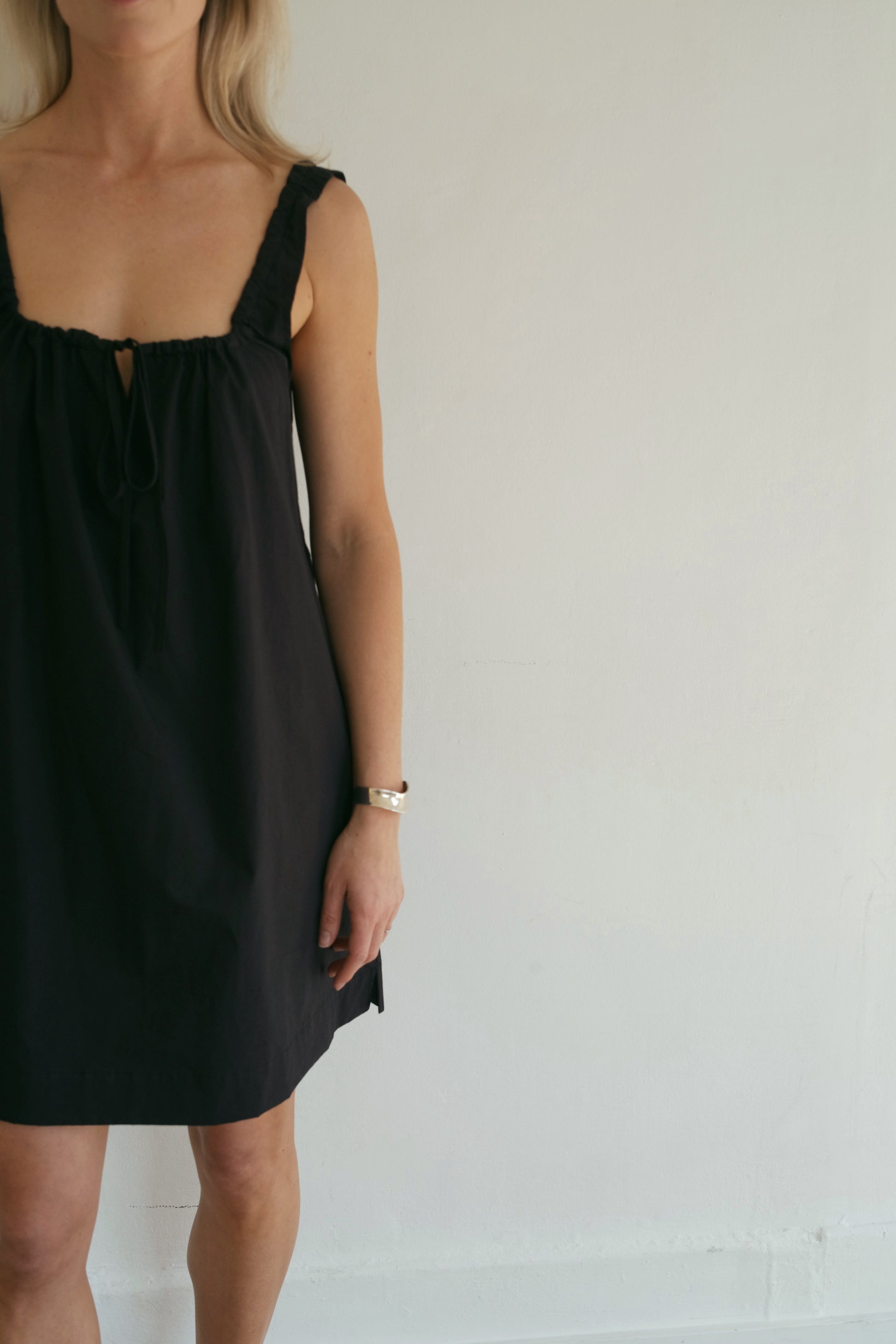 Adjustable tie front dress. Relaxed fit, hits above knee. Hidden pockets at side seams.
